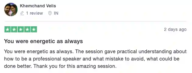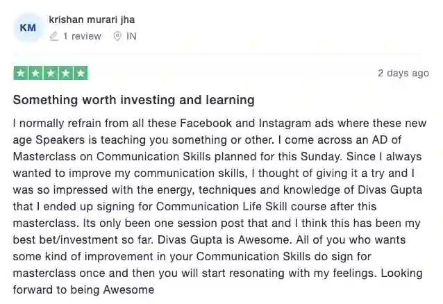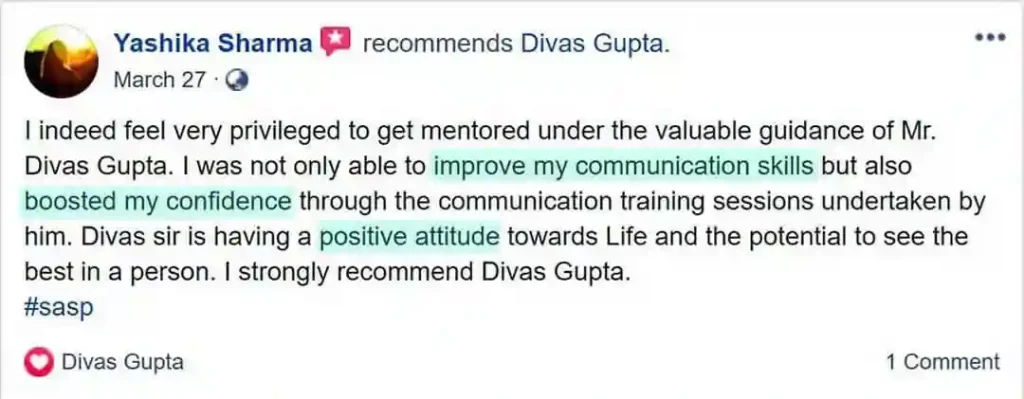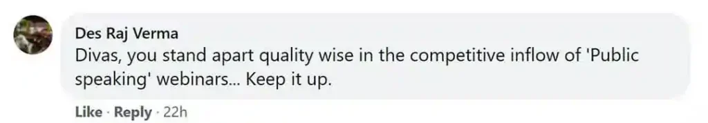 Divas Gupta's training was transformative. He not only sharpened our public speaking skills but also helped us let go of personal baggage that was holding us back. His approach was powerful, personal, and deeply impactful. Grateful for his guidance and wishing him continued success.